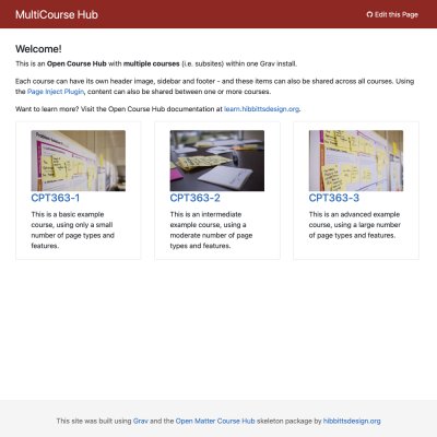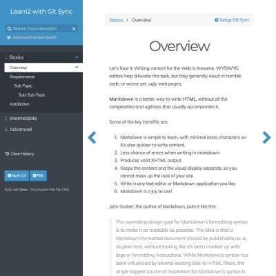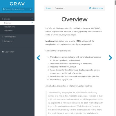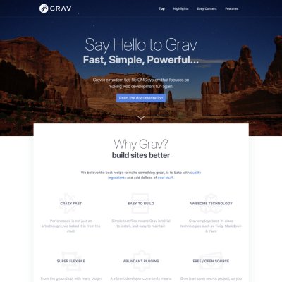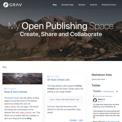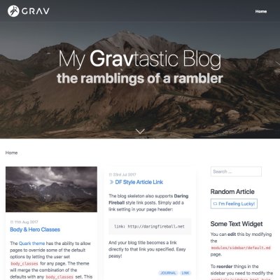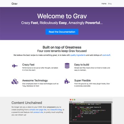 A Grav skeleton is an all-in-one package containing the core Grav system plus sample pages, plugins, configuration. These packages are a great way to get started with Grav.