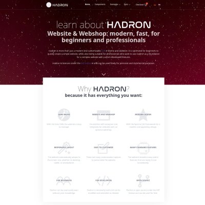 Hadron is a modern and fast Grav Theme and Skeleton for Grav with many other features. Use the Hadron skeleton to start a new website or webshop with our pre made templates and examples. As a beginner, Hadron is perfect because it includes everything you need to start. For professionals, the Hadron skeleton works as a solid base for new custom builds.