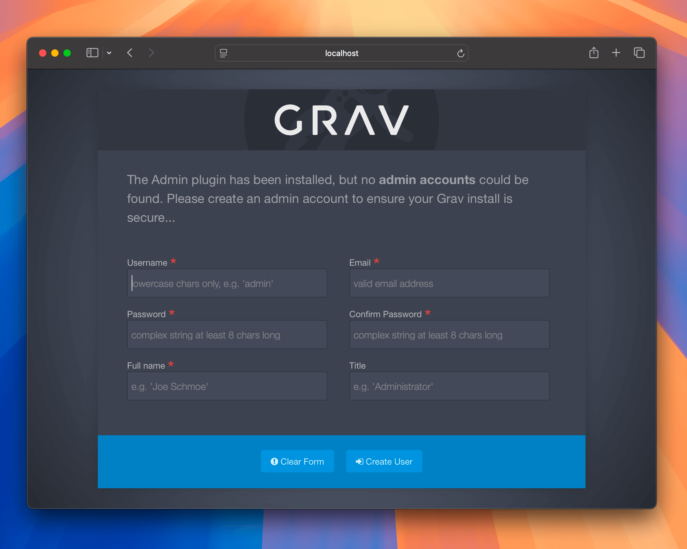 This will extract the zip into a ~/Sites/grav-admin folder. Then simply point your browser at this directory http://localhost/grav-admin: