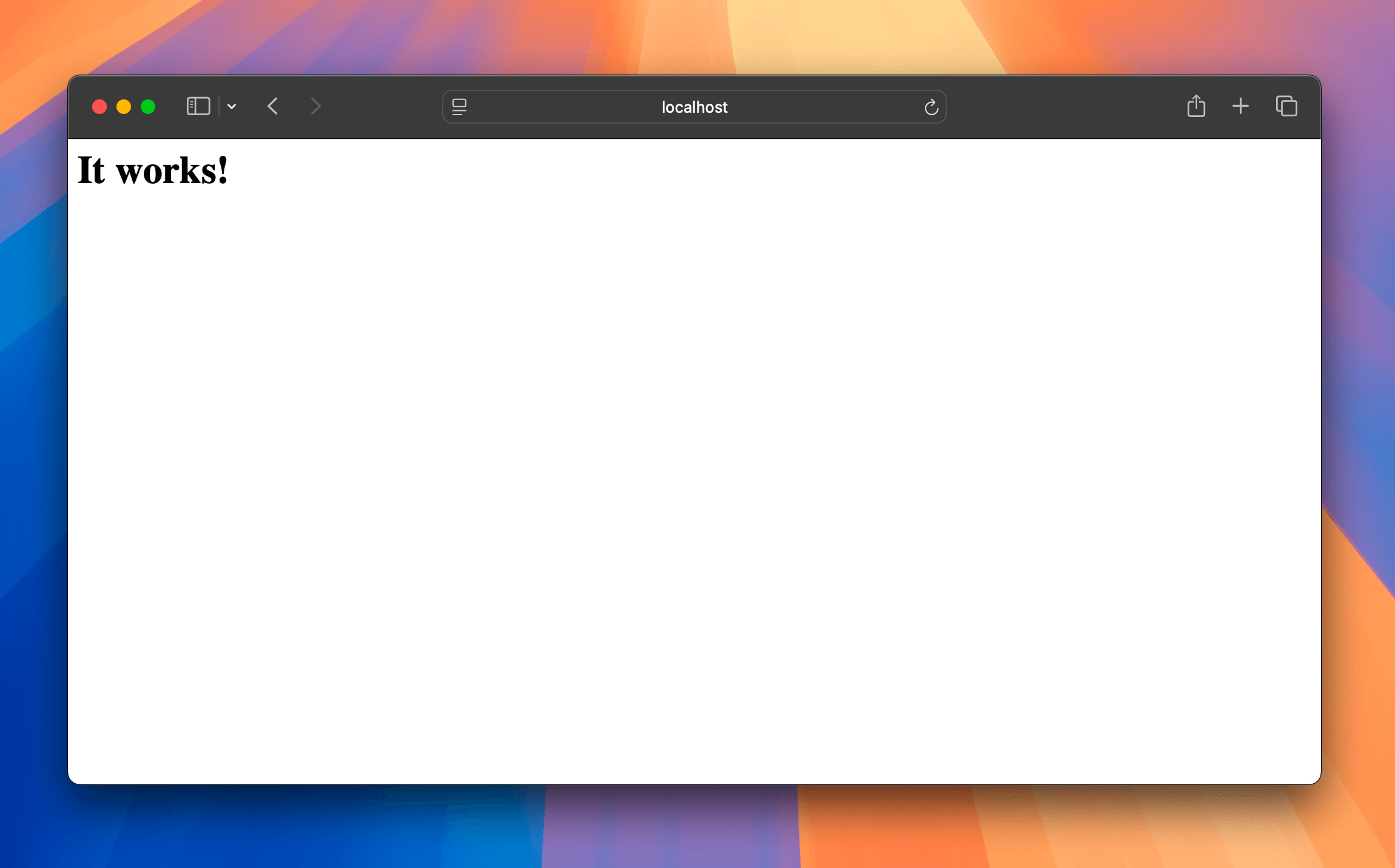 You now have installed Homebrew's Apache, and configured it to auto-start with a privileged account. It should already be running, so you can try to reach your server in a browser by pointing it at http://localhost:8080, you should see a simple header that says "It works!".