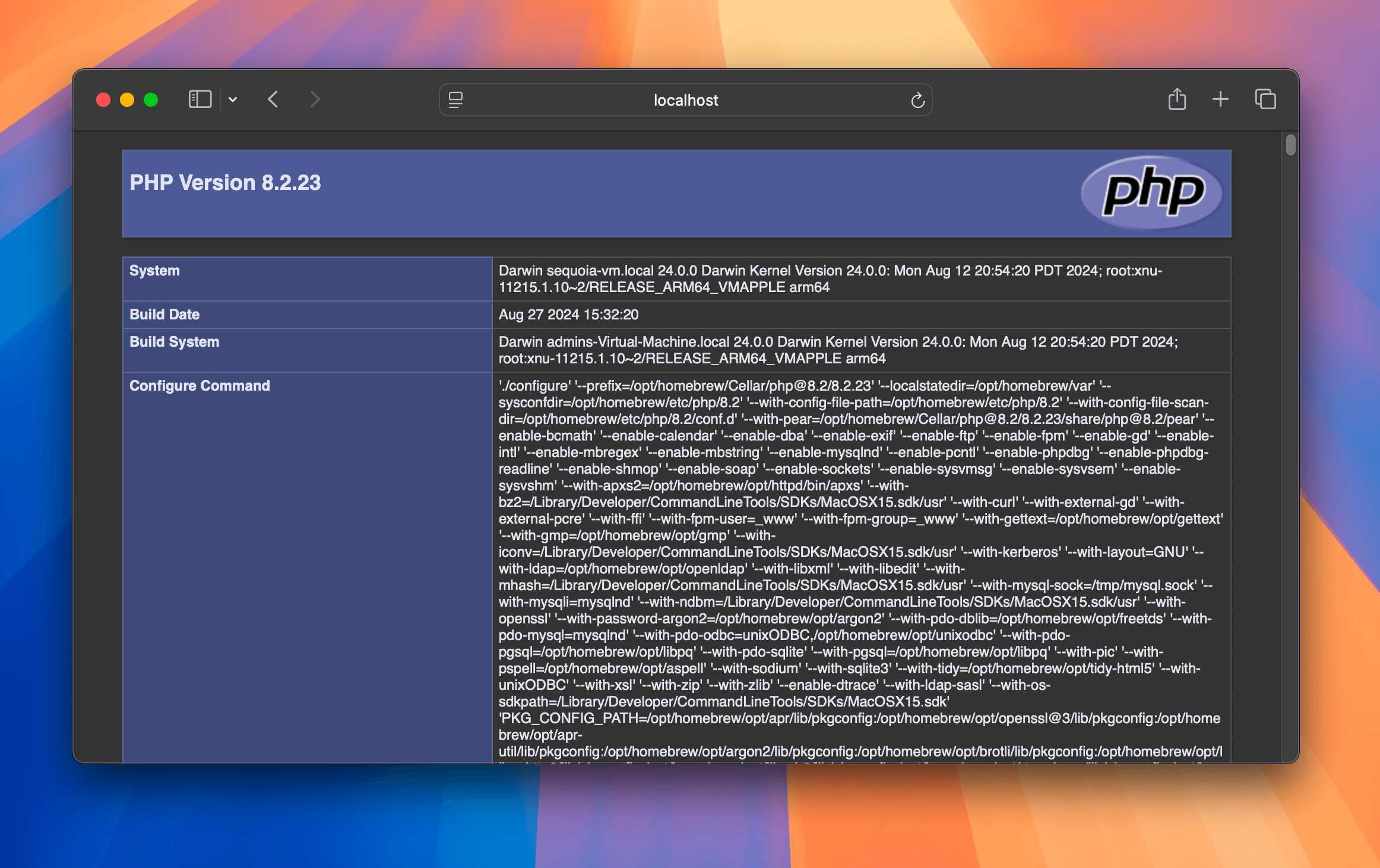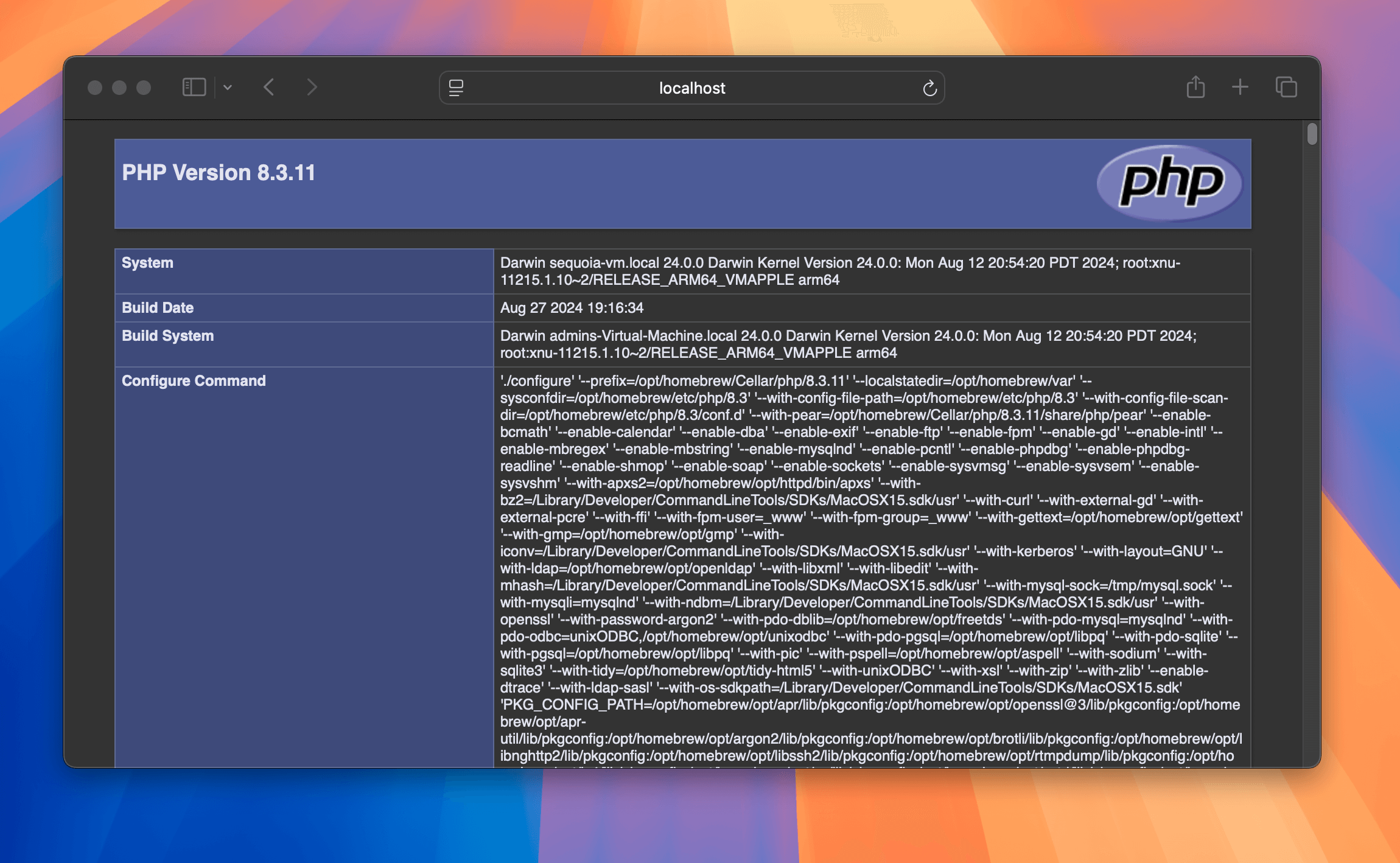 Test to see if your Apache is now running PHP 8.3 by again pointing your browser to http://localhost/info.php. With a little luck, you should see something like this: