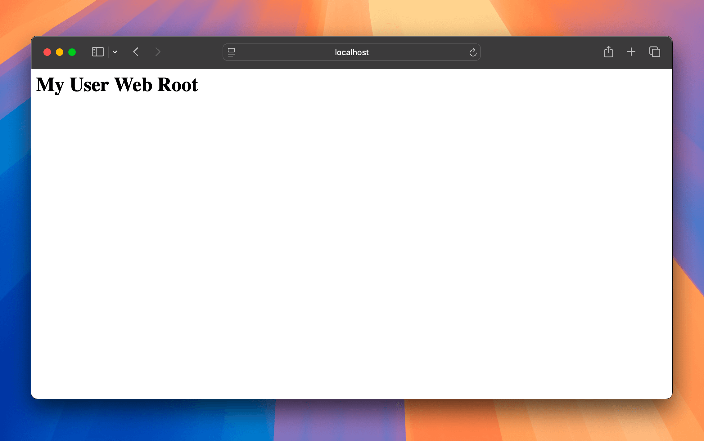 Now, you need to create a Sites folder in the root of your home directory. You can do this in your terminal, or in Finder. In this new Sites folder create a simple index.html and put some dummy content in it like: <h1>My User Web Root</h1>.